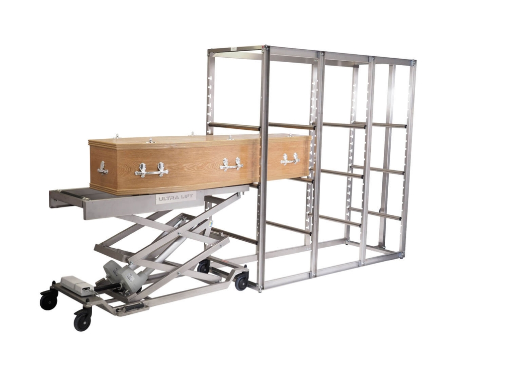 The Ultra Lift is battery powered and mains chargeable and is controlled from a mounted foot controller. The product can reach a 3 tier mortuary fridge and is available with a standard length top or a longer top.