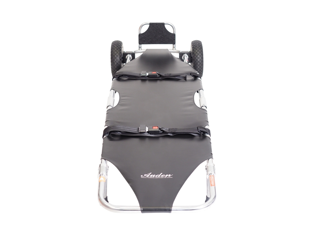 The Stair Stretcher Pro is a new design which allows the user to remove the stair-climber wheels using the quick release button system. This lightweight funeral stretcher is robust enough for most removals and benefits from having a contoured foot end to aid manoeuvrability in tight spaces. The clever tri-wheel assembly has been neatly brought into the frame width allowing controlled descent of almost any stairs at any angle.